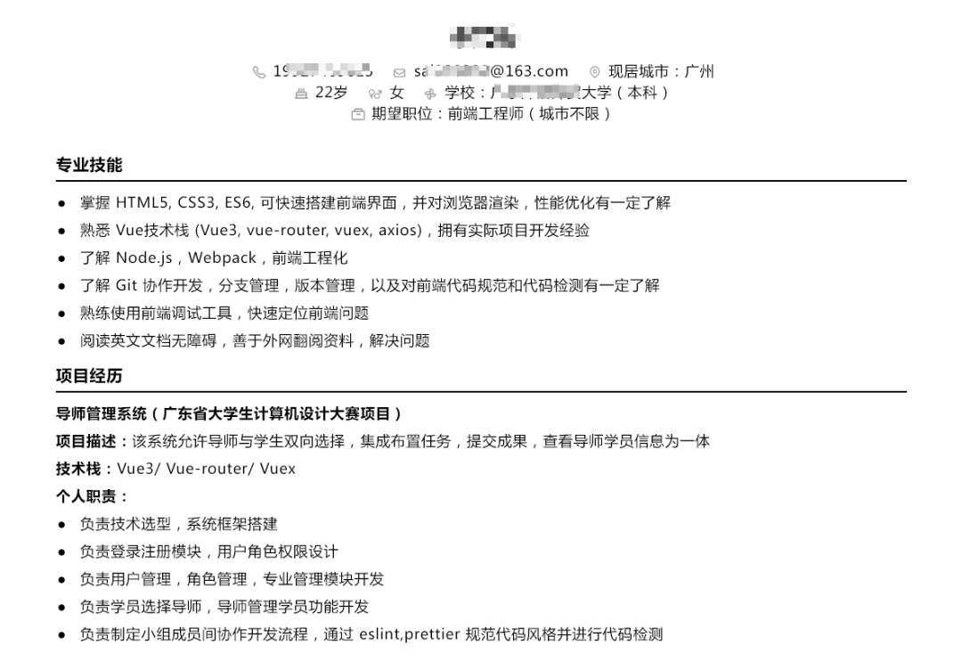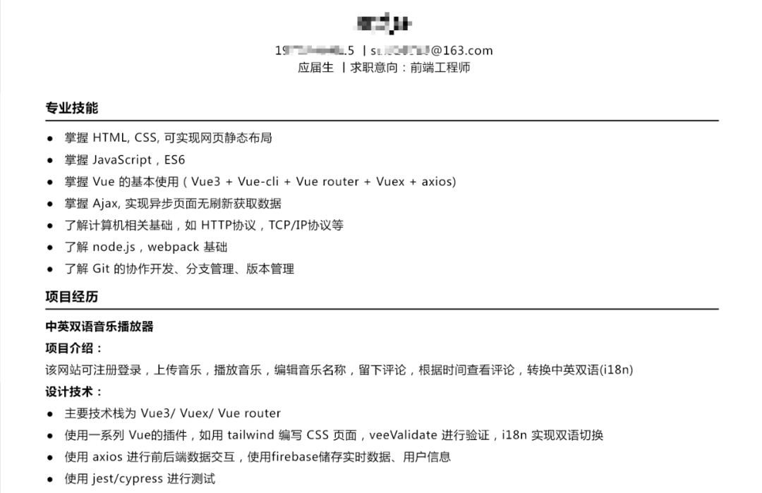注:「计算机基础,HTTP协议,Node,webpack」写上去就要做好被问到的准备。要提前准备一下相关的面试题复习一下,可能很大概率被面试官问到。