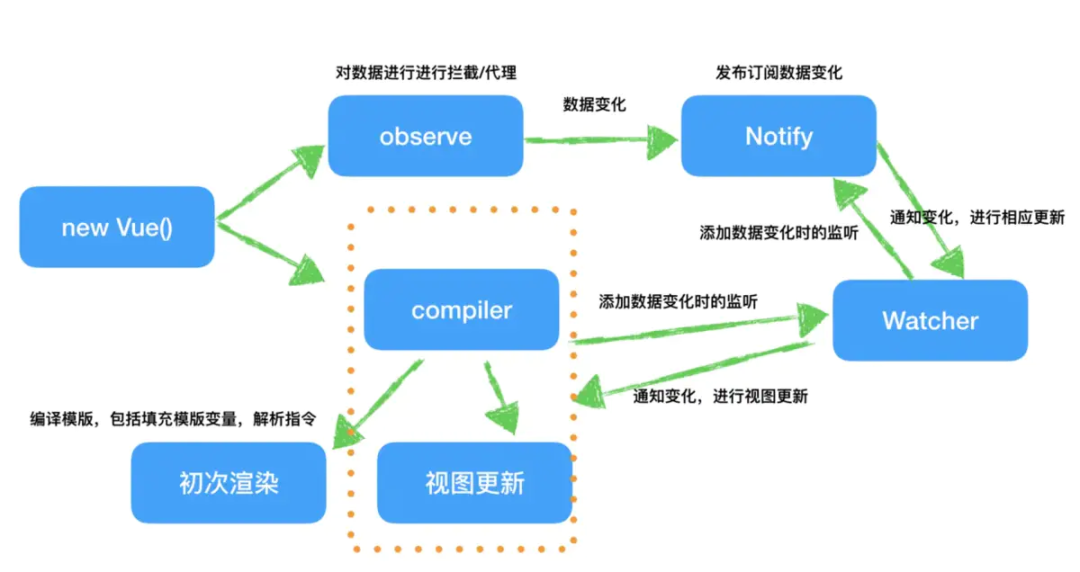 这里的依赖收集过程具体指:当调用 compiler 中的 replace 方法时,我们会读取数据进行模版变量的替换,这时候「读取数据时」需要做一个标记,用来表示「我依赖这一项数据」,因此我要订阅这个属性值的变化。Vue 中定义一个 Watcher 类来表示观察订阅依赖。这就实现了整套流程,换个思路再复述一遍:我们知道模版编译过程中会读取数据,进而触发数据源属性值的 getter,因此上面所说的数据代理的「加工」就是在数据监听的 getter 中记录这个依赖,同时在 setter 触发数据变化时,执行依赖对应的相关操作,最终触发模版中数据的变化。我们抽象成流程图来理解: