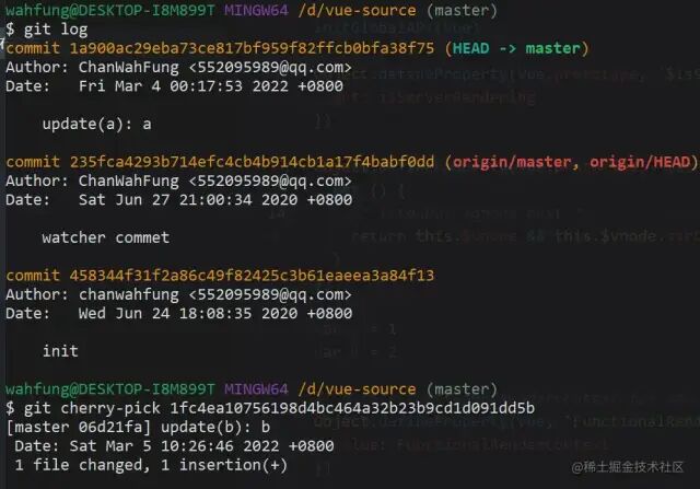 完成后看下最新的 log,b 已经应用到 master,作为最新的 commit 了。可以看到 commitHash 和之前的不一样,但是提交时间还是保留之前的。
