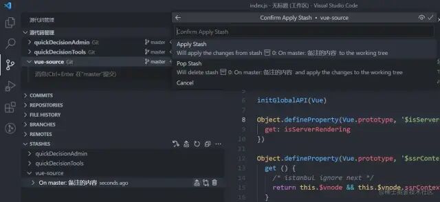 先点击stash记录旁的小箭头,再点击 apply 或者 pop 都可恢复 stash
