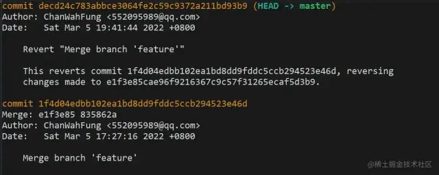 再来看下最新的 log,生成了一条 revert 记录,虽然自己之前的提交记录还是会保留着,但你修改的代码内容已经被撤回了。