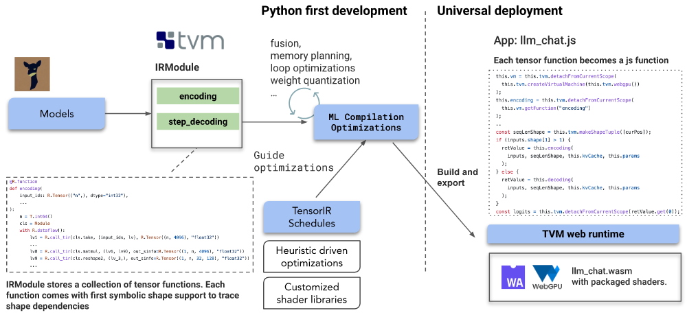其关键技术是机器学习编译(MLC)。基于开源生态构建,包括 Hugging Face、LLaMa 和 Vicuna 的模型变种、wasm 和 WebGPU。主流程基于 Apache TVM Unity 构建。