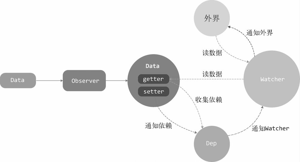 触发更新是通过数据属性的 setter 方法,通知 Dep