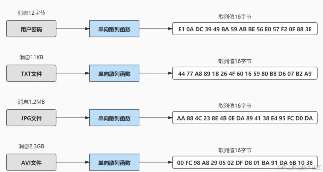 常见应用场景:由于不可逆性,常用于密码存储、数字签名、电子邮件验证、验证下载