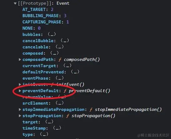 我们可以打印看看这个事件参数,顺着原型链找到event对象,里面有个preventDefault,这个就是禁用a标签默认的跳转行为