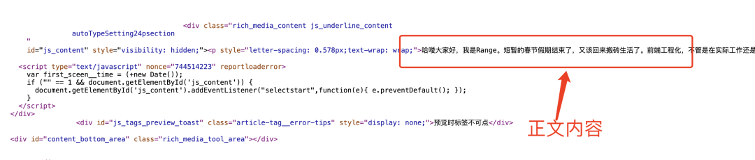随便打开一篇公众号的文章,以 最近的一篇文章 为例,直接查看网页源代码,我们将文章内容作为关键字进行查找,可以在页面中发现对应的区域。