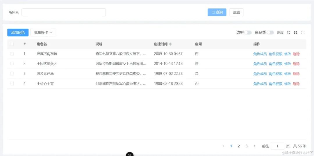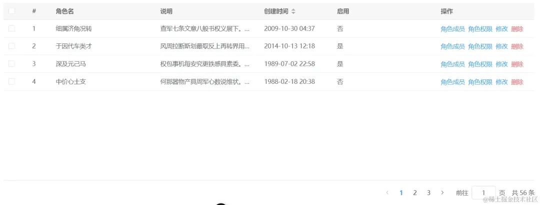 操作列角色成员,角色权限和修改,都需要打开一个抽屉界面(抽屉界面里的东西另算,不算在列表页中),删除需要调后端接口以及确认,因此