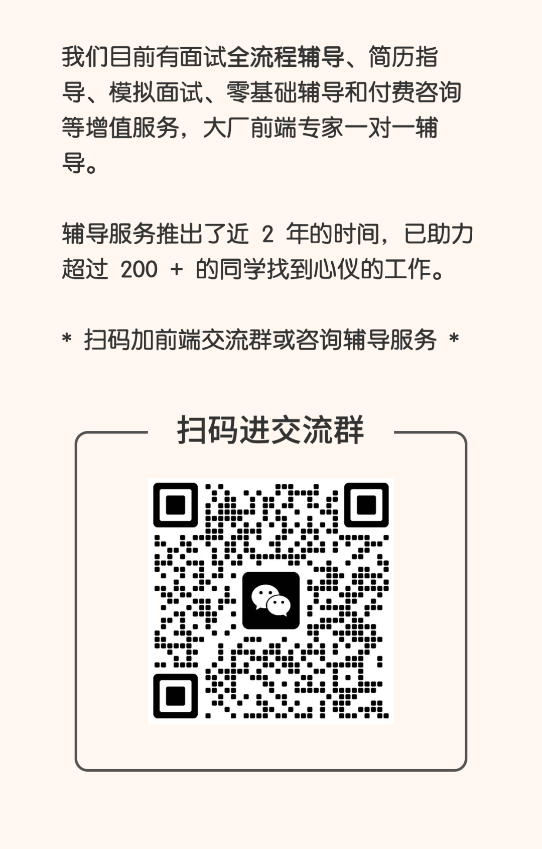 还没有使用过我们刷题网站(https://fe.ecool.fun/)或者前端面试题宝典的同学,如果近期准备或者正在找工作,千万不要错过,题库主打无广告和更新快哦~。