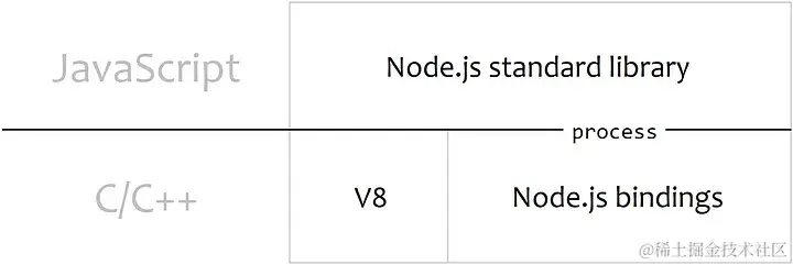 标准库是用 JavaScript 编写的,它提供了你熟悉的高级 Node.js API,就像你平常使用的那些功能一样。这个 API 是建立在本地、低级别的绑定之上的,这些绑定让你能够访问操作系统的特性,比如文件系统或进程控制。这些绑定通过一个叫做"process"的对象与标准库进行通信。换句话说,"process"是 Node.js 进程中唯一来自于非 JavaScript 部分的东西,稍后我们会详细讨论这个。