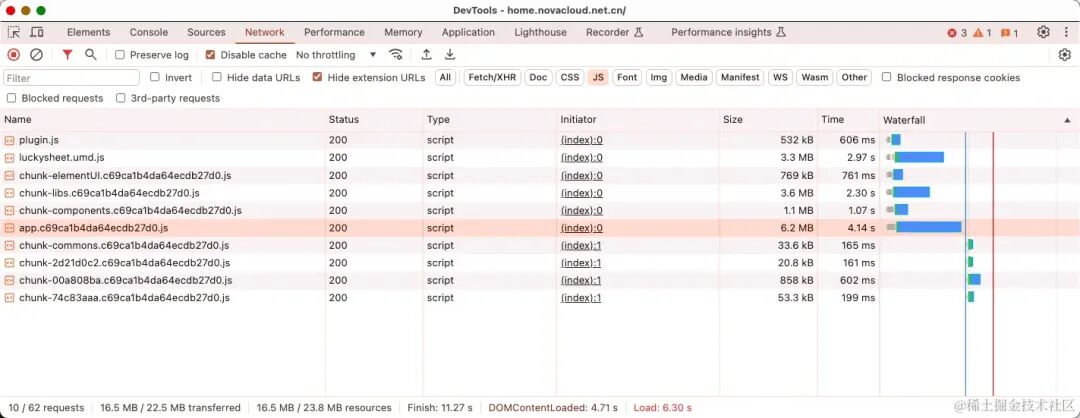 注意优化后的时间chunk-vendors.js和app.js加载一共耗时1.59s,不是1.11+1.59,chunk-vendors的下载解析会阻塞app.js的下载解析,所以一共1.59s。
