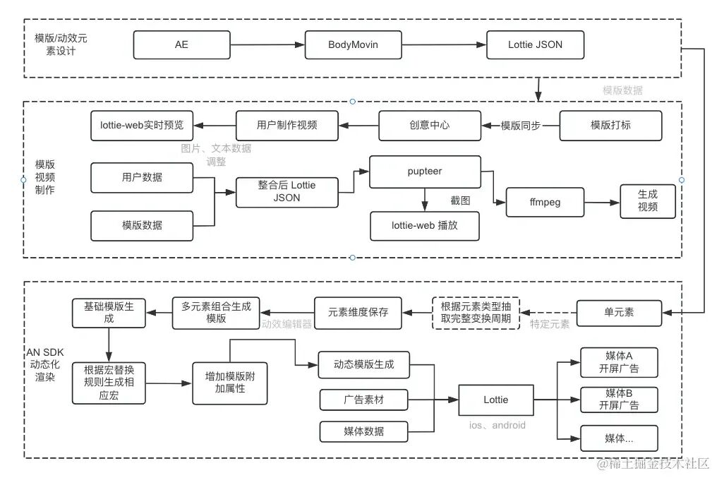 我们都知道,视频相比较图片能传达更多的有效信息,更能吸引注意力,那在广告业务中也是同理的。这里我就主要介绍下在广告视频广告业务的经历,主要有两段经历,第一段经历是在短视频蓬勃发展的时期,为了赶上这种变化,我们积极主动地进行技术探索,致力于寻找一种能够帮助用户快速创建视频创意的方案。经过我们的不断尝试,最终确认通过使用“AE+Lottie”方案实现模版的制作和播放,使用“pupteer+ffmpge”生成最终的视频文件。这个方案在当时的电商广告行业也是一种创新,通过我们方案,能有效的为广告主提供了视频创意制作的途径。我很荣幸能参与到这个项目,同我们前端团队的架构师,以及后端、算法团队共同来完成这件事情。这次项目经历不仅提升了我的专业技能,也进一步开阔了我的视野,也为我后续的发展做了良好的铺垫。