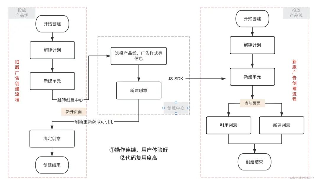 第二个难题便是用户操作路径过长,那为了解决这个事情,我也是进行了技术调研,这个是我在极短的时间内做的第一次调研,在调研完成之后,也是找到团队Leader、产品主动去沟通了这个事,他们都认可了我这个方案,最终我使用JS-SDK的方案,将广告创建创意的核心代码通过该方式赋能给相关投放产品线。最终达到的效果是,从最初的反复跳转造成操作中断,到后面的当前页面建创意,整体操作连续,用户的体验得以提升,在代码层面一套代码既应用在项目中,也赋能到各个产品线中。