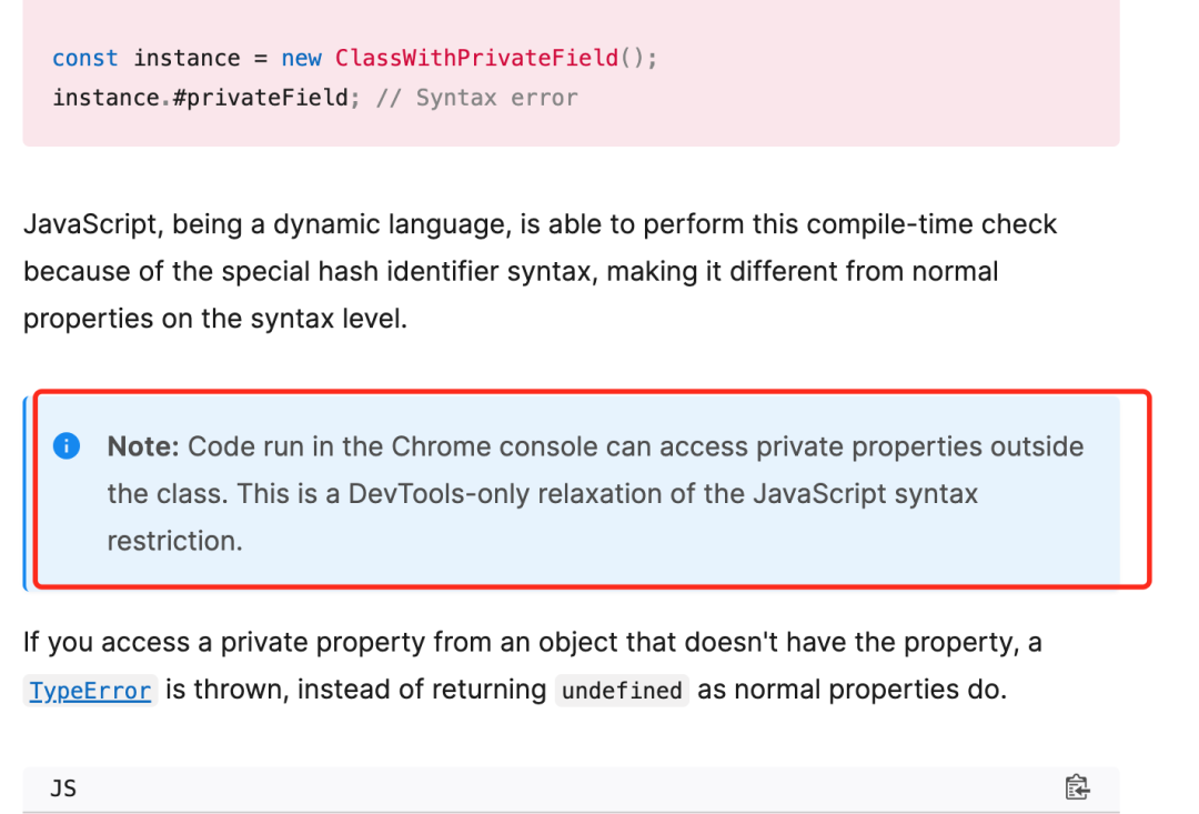 ,没有报错,难道我们记错了?进一步找答案,在MDN官方链接里,找到了说明(https://developer.mozilla.org/en-US/docs/Web/JavaScript/Reference/Classes/Private_properties):