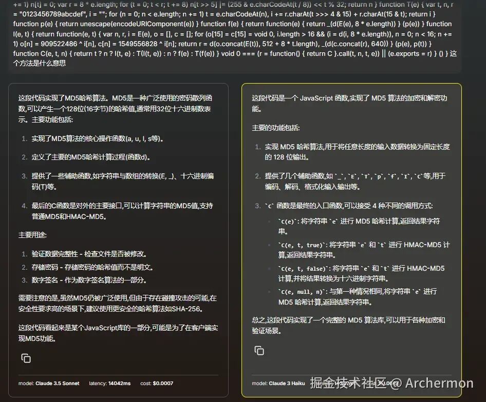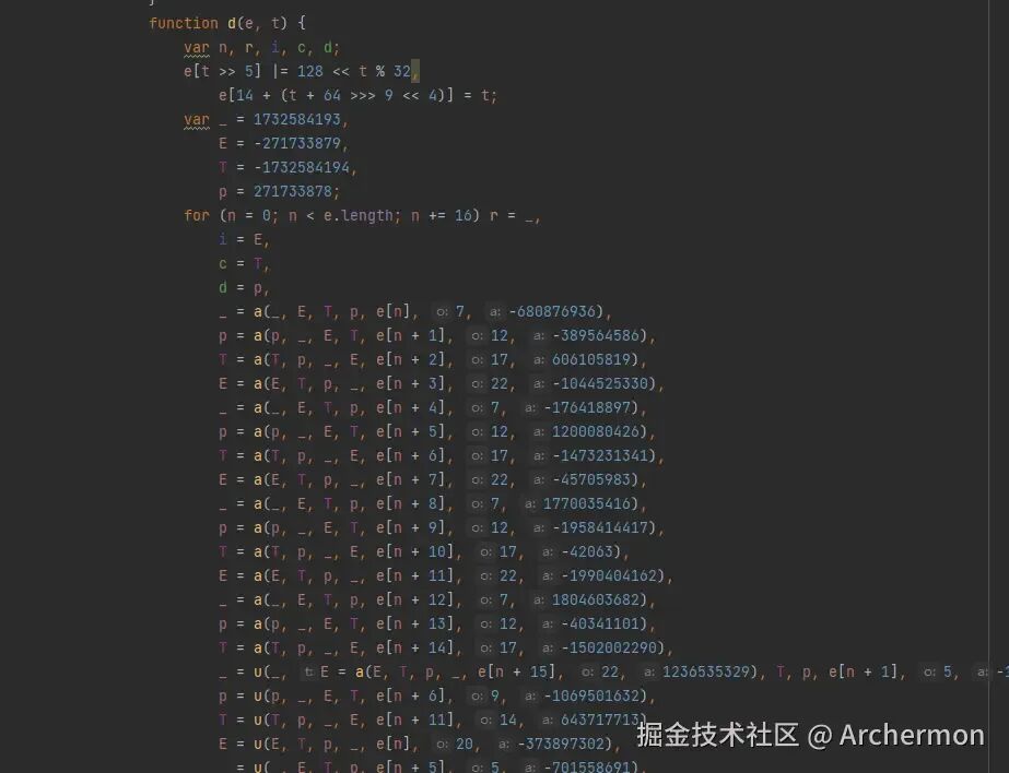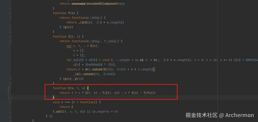 gpt 真是厉害,没看到任何关于 md5 的字母,却分析出来了,并且告诉我 c 就是入口函数,而且刚好是三个参数,刚好跟之前调用 R 方法的的三个参数对应上,那我就大胆猜测就是直接调用了这个方法