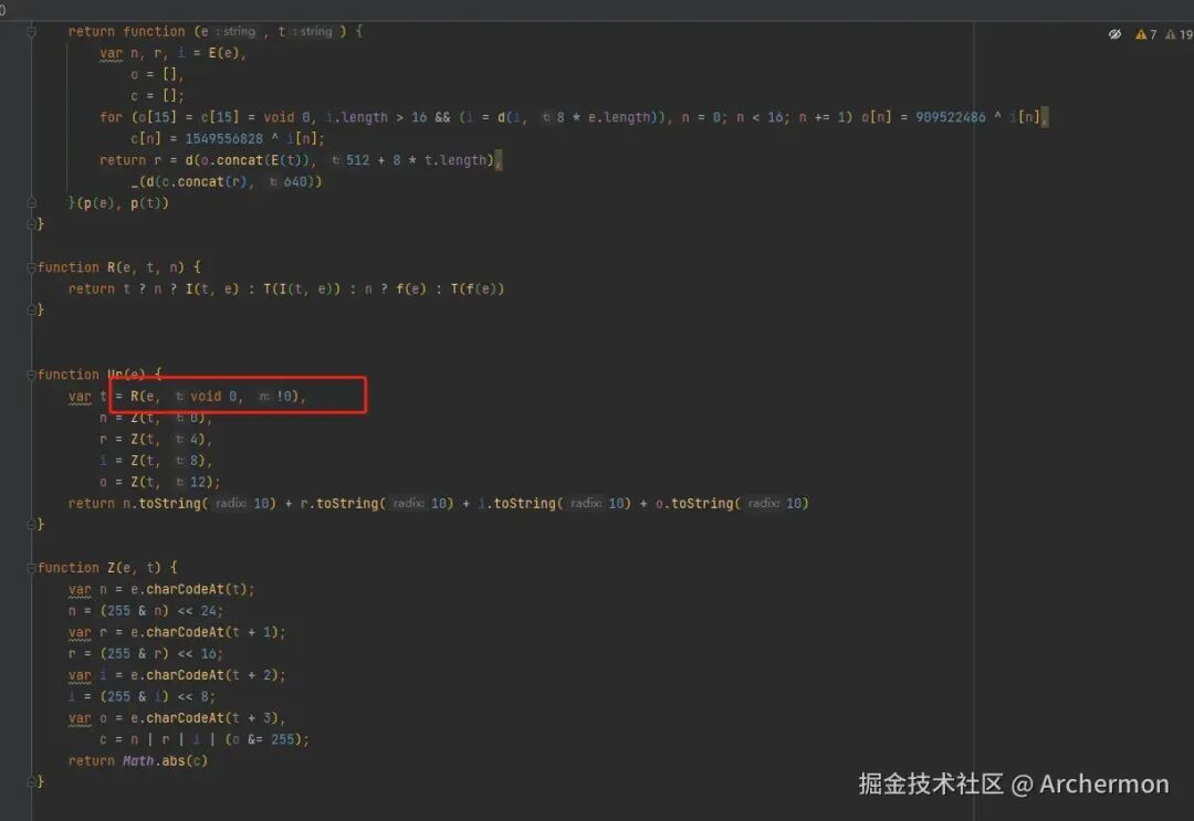 主要函数有 Z、R 函数,不确定是什么,继续点击 Z、并且 R 函数传入了三个参数,e 就是我们的拼接字符串,void 0 和!0 ,不知道是什么意思,但是记住是三个参数