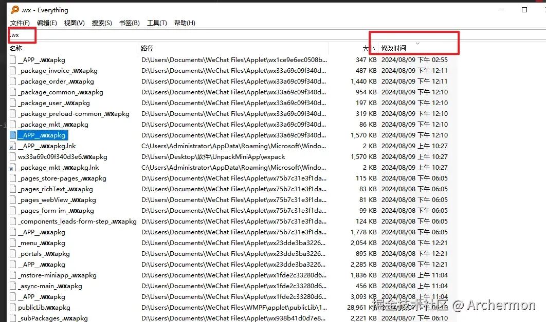 首先先下载一个 everything(快速搜索文件的软件)输入.wxapkg 后缀名,然后点击修改时间倒叙排序(要提前删除小程序,重新进入登录,才能准确找到小程序加密包)