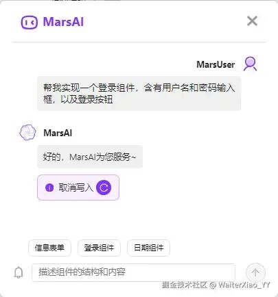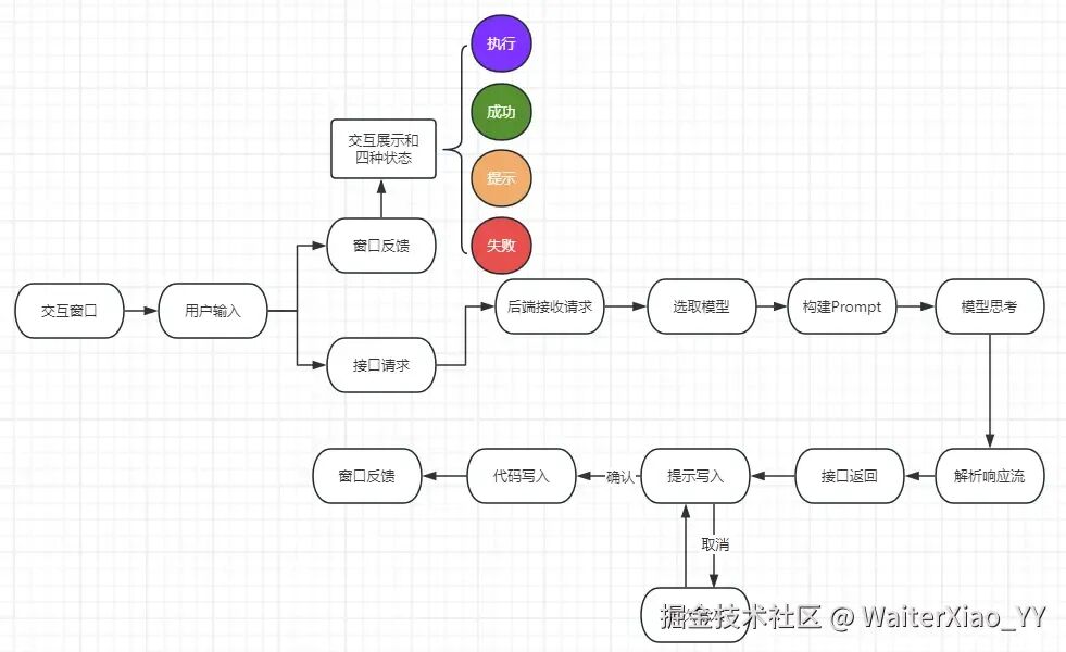 首先是要明确这个交互窗口的功能,由于这个AI助手只是一个代码生成工具,不是一个聊天工具,所以它不需要复杂的信息流设计,能够接收一个输入,然后展示这个输入,并且反馈用户当前的状态就行。