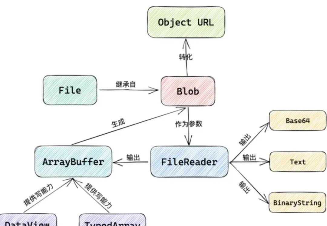 (Binary Large Object)对象是用来表示二进制数据的一个接口,可以存储大量的二进制数据。Blob 对象可以通过构造函数进行创建,也可以通过其他 API 生成,例如通过 FormData 对象获取上传的文件。 而 ArrayBuffer 是 JavaScript 中的一个对象类型,用于表示一个通用的、固定长度的二进制数据缓冲区。我们可以通过 ArrayBuffer
