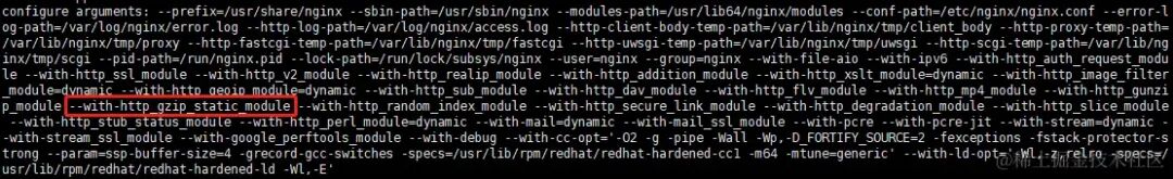 如果显示如上图所示的:–with-http_gzip_static_module,就说明你的 nginx 服务器已经支持 gzip 了,可以开始配置 gzip 压缩了。