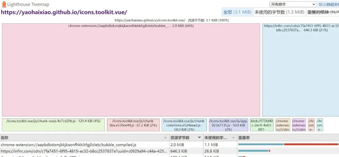 属性,避免脚本阻塞页面渲染。上图是通过 Lighthouse 分析出的 js 代码的覆盖率的统计图。通过它可以知道页面中未使用的 js 资源的占比,我们可以根据统计数据,想办法尽量减少未使用 js 资源的占比。